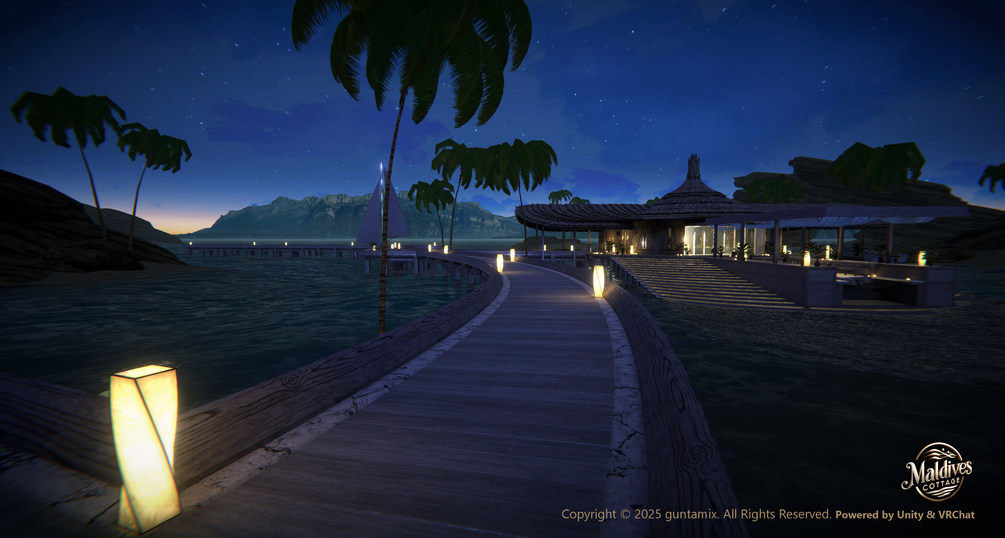 "Maldives Cottage" is a highly immersive resort world set in an overwater villa inspired by the Maldives. Optimized for VRChat and fully compatible with Unity 2022.3.22f1 / VRCSDK3, this asset is ready to be used in your own world out of the box.